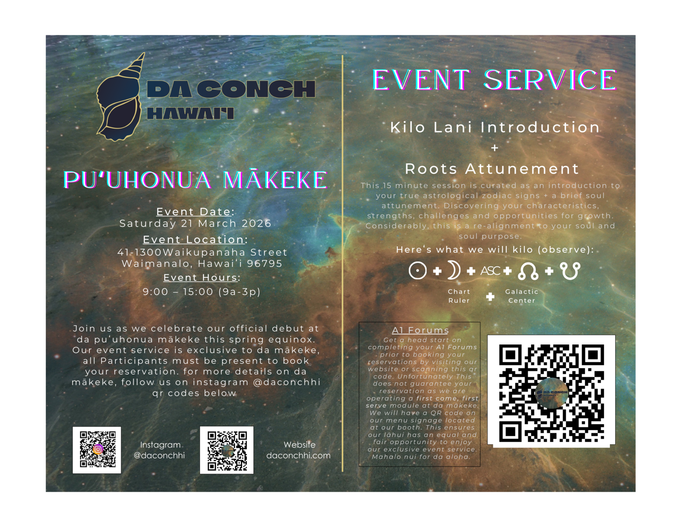 Join us in celebrating our official debut at da Puʻuhonua Mākeke, in addition to the dawn of our spring equinox. We will be providing an exclusive event service, dedicated to the education and illumination of Kilo Lani x True Sidereal. More details are provided at various locations, such as: @daconchhi (instagram), @puuhonuamakeke (instagram), www.daconchhi.square.site (reservations). As we look forward to our future, we canʻt wait to share our ʻike with da paeʻaina.
